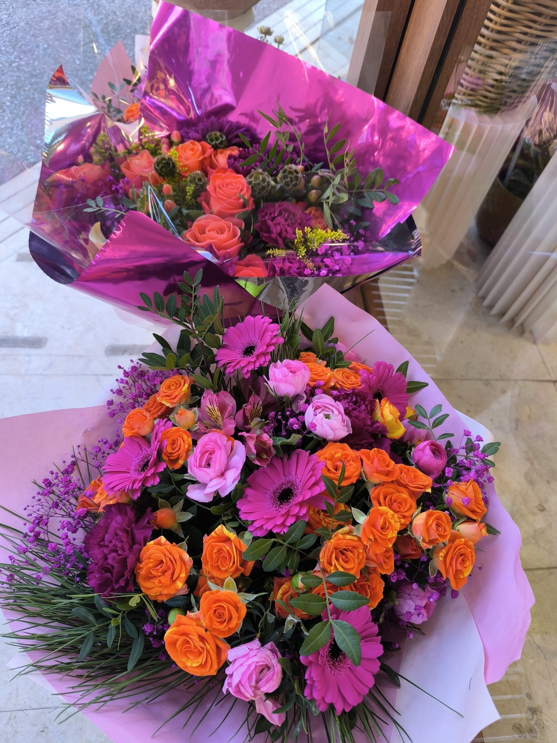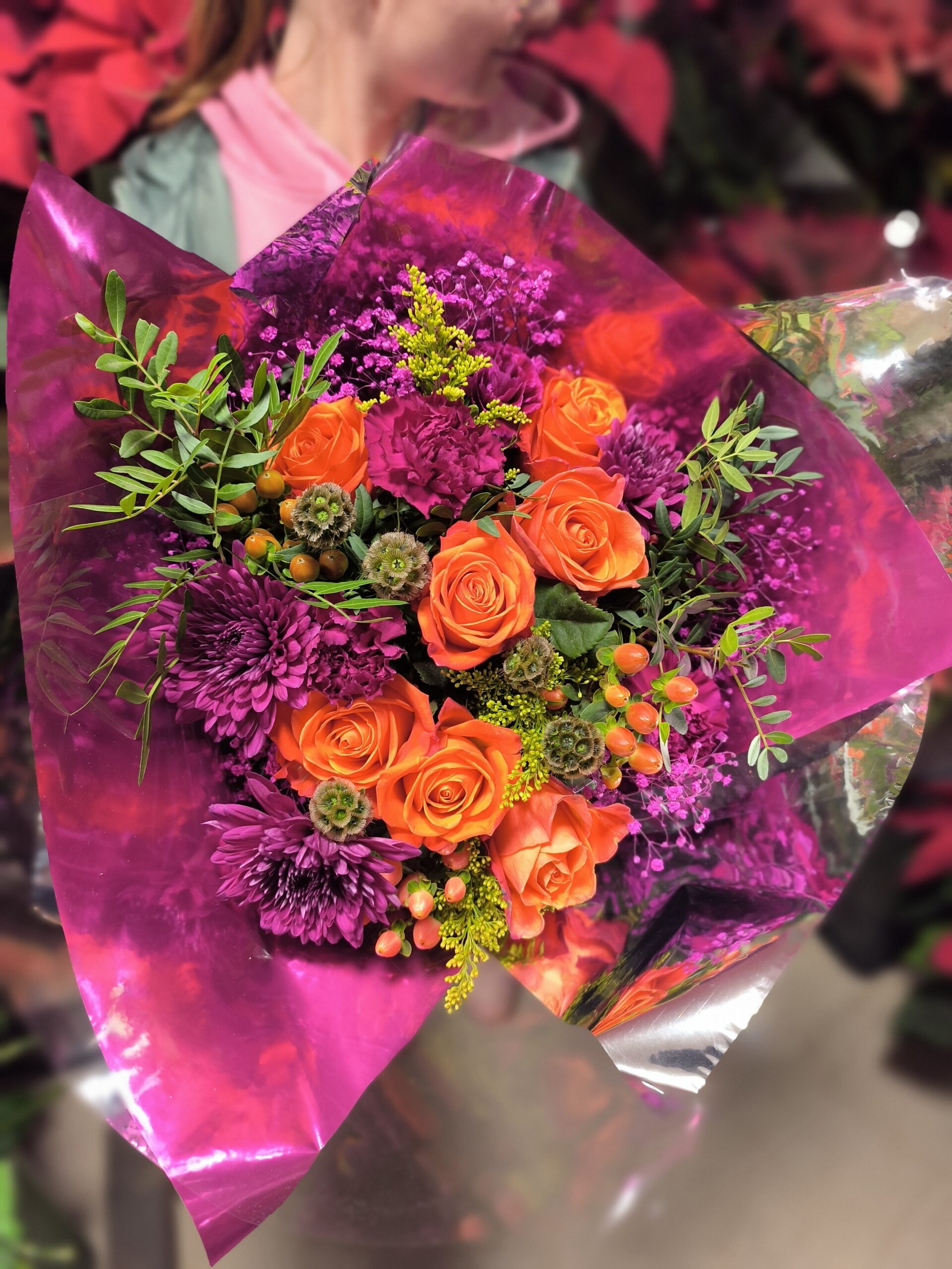 Bouquet rond dans les tons colorés et festif autour du rose, du fuchsia et de l’orangé !